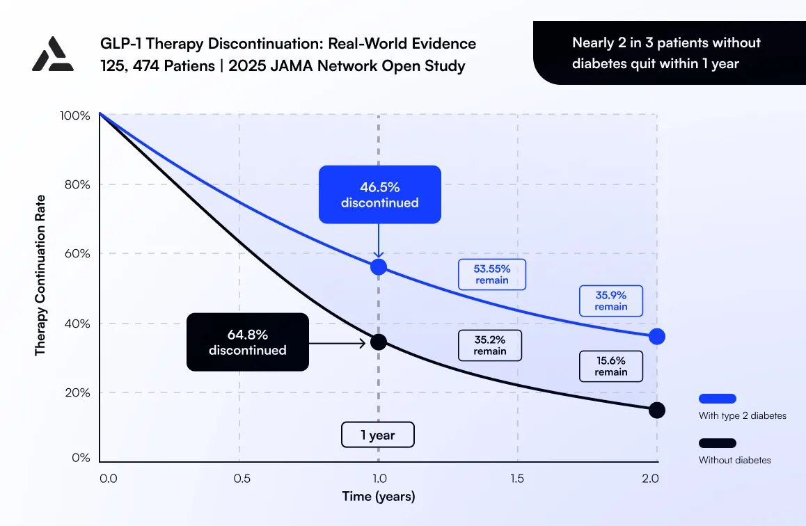 Real-world outcomes tell a different story. A 2025 retrospective cohort of 125,474 adults initiating GLP-1 receptor agonists found that 46.5% of patients with type 2 diabetes and 64.8% without type 2 diabetes discontinued therapy within one year.